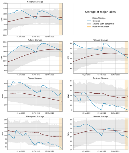 The graphs below show the national situation, as well as storage of individual hydro schemes alongside their historical means and 10th to 90th percentile. The yellow indicates the most recent week.