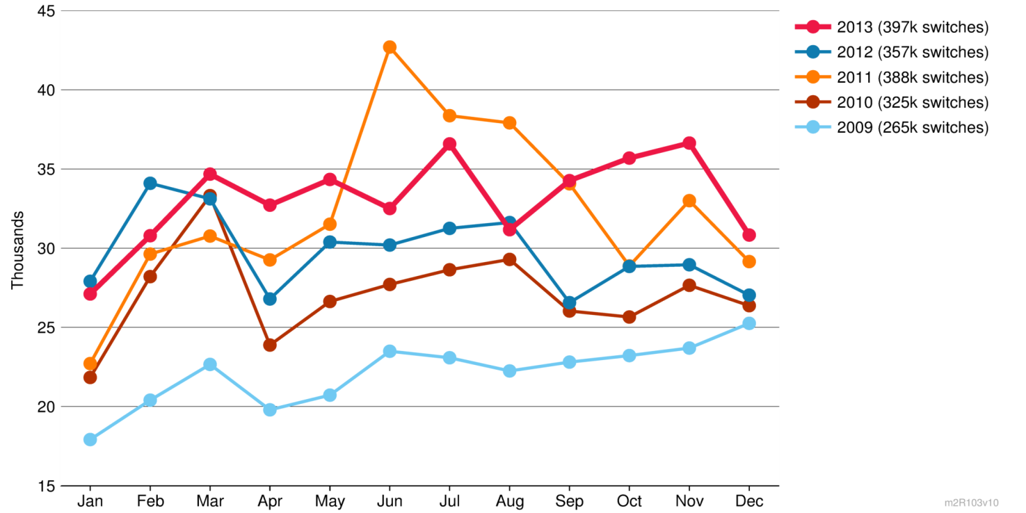 In 2013, 396,383 consumers (19.75% of all consumers) switched electricity suppliers compared to 356,751 consumers who made switches in 2012.